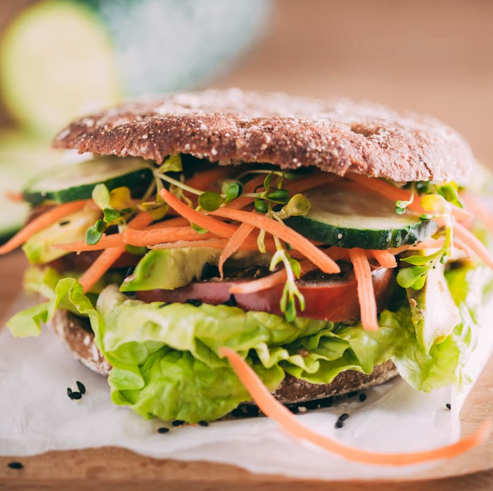 - Spread the mashed avocado evenly over one side of the whole grain bread. Layer the sliced cucumber, shredded carrots and romaine lettuce on top of the avocado spread.